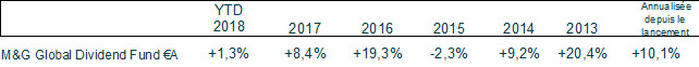 Le fonds investit principalement dans des actions d’entreprises. Par conséquent, sa valeur liquidative est susceptible de présenter une plus grande volatilité que celles des fonds investissant dans les obligations et/ou les instruments monétaires. Veuillez noter que la valeur des investissements et du revenu qui en découle peut fluctuer et ainsi faire baisser ou augmenter la valeur liquidative du fonds. Rien ne garantit que l’objectif du fonds sera atteint et il est possible que vous ne puissiez pas récupérer le montant investi à l’origine. Les performances passées ne préjugent pas des performances futures. Ce document est destiné à l’usage des professionnels uniquement, sa distribution est interdite à toute autre personne ou entité, qui ne devrait pas s’appuyer sur les informations qu’il contient. La distribution de ce document en Suisse ou à partir de la Suisse n’est pas autorisée à l’exception de la distribution aux investisseurs qualifiés tels que défini par la loi suisse sur les placements collectifs de capitaux, l’Ordonnance suisse sur les placements collectifs et la Circulaire de l’autorité suisse de surveillance (« Investisseur qualifié »). Celui-ci est mis à disposition du destinataire initial (à condition qu’il s’agisse d’un Investisseur Qualifié) uniquement. Les organismes de placement collectif visés dans le présent document (les «fonds») sont des sociétés d’investissement ouvertes à capital variable, constituées en Angleterre et au pays de Galles pour les fonds M&G Investments et au Luxembourg pour les fonds M&G (Lux). Les Statuts, le Prospectus, le Document d’Informations Clés pour l’Investisseur (DICI), les Rapports Annuels et Intérimaires et les Etats Financiers du Fonds peuvent être obtenus gratuitement auprès du Gérant : M&G Securities Limited, Laurence Pountney Hill, London, EC4R 0HH, R.-U. ; ou l’un des suivants – M&G International Investments Limited ou auprès de sa succursale en France ; de l’agent centralisateur français du Fonds : RBC Investors Services Bank France ; M&G International Investments Switzerland AG, Talstrasse 66, 8001 Zurich; ou Société Générale, Paris, Zurich Succursale, Talacker 50, P.O. Box 5070, 8021 Zurich, qui agit en tant que représentant suisse des fonds (le «Représentant suisse») et agit en tant qu’agent payeur suisse. Avant de souscrire, il est recommandé de prendre connaissance du Prospectus, qui comprend les risques de placement liés à ces fonds. Ce document financier promotionnel est publié par M&G Securities Limited. Siège social : Laurence Pountney Hill, London EC4R 0HH, autorisé et réglementé par la Financial Conduct Authority au Royaume-Uni.