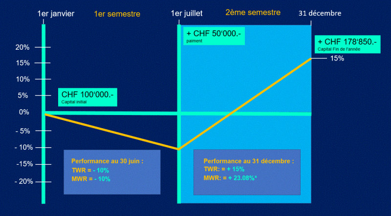 Le MWR est nettement plus difficile à calculer, étant donné que l’on doit prendre en compte le versement de CHF 50 000 réalisé en milieu d’année dans le calcul de la performance.