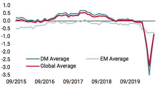 Le message véhiculé par le niveau actuel des spreads « post-reprise » est clair: l’activité économique a déjà fortement repris, mais il faudra encore tenir compte des risques sanitaires et géopolitiques, car des vents contraires pourraient empêcher une reprise généralisée à court terme. Cela s’aligne sur le niveau des taux souverains. Malgré une forte hausse des points morts d’inflation, les taux nominaux restent historiquement bas, tandis que les taux réels ont plongé en territoire profondément négatif, autre indice que les investisseurs en obligations n’ont pas encore pris en compte la forme en V dans la prime de croissance. La seule classe d’actifs qui reflète actuellement des attentes plus favorables est celle des actions, principalement à travers l’expansion du ratio cours/bénéfice, dont les valorisations prévoient un redressement complet des bénéfices, de -25% en 2020 à +30% en 2021 pour le MSCI World