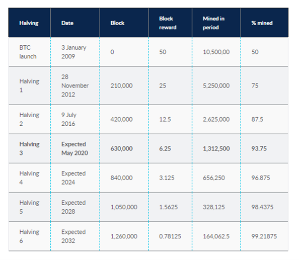 Le Bitcoin est le premier actif numérique qui ne peut pas être copié, dupliqué, piraté ou falsifié. Lors du lancement du Bitcoin en 2009, son ou ses développeurs ont stipulé dans le protocole que la production de bitcoin serait un jour plafonnée à 21 millions. A noter que l’offre actuelle est d’environ 18.5 millions et que la production de nouveaux Bitcoin diminue de moitié environ tous les quatre ans («le halving» tel que décrit dans le tableau ci-dessous).