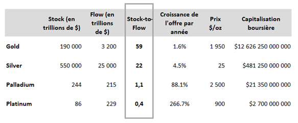 L’argent vient ensuite avec un SF de 22. Par contre, le palladium et le platine ont un SF à peine supérieur à 1. Le stock existant est généralement égal ou inférieur à la production annuelle, cette dernière devenant dès lors un facteur déterminant.