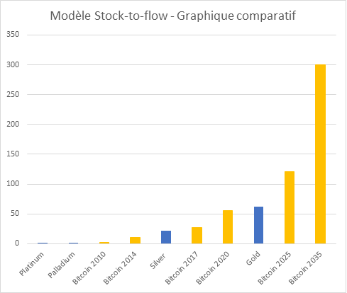 Etant donné les propriétés uniques du Bitcoin (par exemple une offre limitée dans le temps), le modèle du stock-to-flow semble pouvoir s’appliquer au Bitcoin de la même manière que sur les métaux précieux.