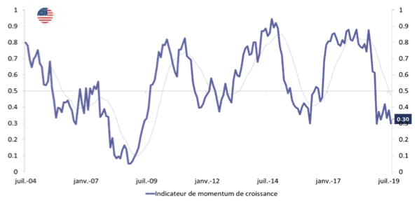 Aux Etats-Unis, les signes de ralentissement se multiplient, comme le montre notre indicateur MMS de Momentum économique à 30 sur 100. C’est le secteur manufacturier qui est en première ligne depuis de nombreux mois dans un contexte de tensions commerciales récurrentes. Néanmoins, la croissance reste encore solide, 2%, au deuxième trimestre – grâce à une consommation toujours dynamique. En outre, les derniers indicateurs d’activité en provenance des Fed régionales ne laissent pas présager une baisse brutale de l’activité à court terme. En cas de guerre commerciale totale – la mise en œuvre de la dernière salve de taxes douanières promise par Donald Trump débute ce 1er septembre – la situation pourrait néanmoins se dégrader rapidement.
