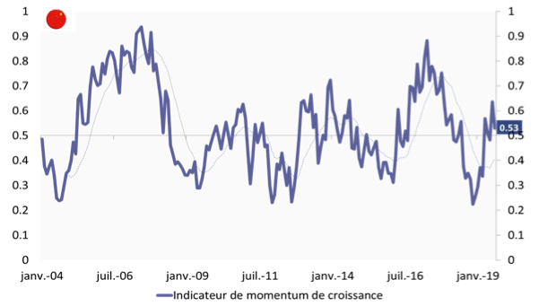 En dépit des mesures de relance financières et budgétaires, la croissance chinoise patine avec un MMS de Momentum Economique à 53 sur 100. Malgré la hausse régulière des indicateurs de crédit en Chine depuis fin 2018, à l’image de notre indicateur «China Credit Impulse», les financements au secteur privé peinent à accélérer, en particulier vers les petites entreprises. Même si tout atterrissage brutal semble écarté à ce stade, la Chine est affaiblie politiquement par la situation à Hong Kong – qui plus est l’année des 70 ans de la République Populaire de Chine, dont l’anniversaire sera fêté en septembre et octobre – et économiquement par les tensions commerciales. Elle ne joue plus pleinement son rôle de locomotive de la croissance mondiale.