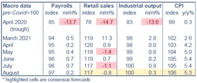 Dans les prochains jours seront publiés les rapports mensuels sur les prix à la consommation (mardi 14), la production industrielle (le 15) et les ventes au détail (le 16). Toutes ces données portent sur août, c’est-à-dire une période de hausse des contaminations au variant Delta. Le taux d’inflation du CPI est attendu proche de son haut niveau récent qui était de 5.4% sur un an en juin et en juillet. Si tel est le cas, cela confirmerait que le rythme instantané de hausse des prix s’est un peu modéré par rapport au printemps dernier. Concernant l’industrie, le secteur subit le manque de biens intermédiaires et des difficultés de recrutement, ce qui freine le redressement de la production mais ne l’empêche pas. L’activité industrielle avait retrouvé son niveau pré-crise en juillet. Malgré son érosion récente, le moral des industriels reste élevé. Concernant les ventes au détail, on sait que les données de mobilité ont marqué le pas ces dernières semaines. A cela s’ajoute le déséquilibre du marché des véhicules qui s’est traduit par une chute des ventes en août (-11% m/m, -29% cumulé depuis avril). La faiblesse des ventes au détail ne doit pas faire oublier que les dépenses de services (2/3 de la consommation) progressent.