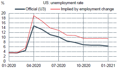 Au printemps dernier, plus de 22 millions d’emplois ont soudainement disparu, puis 60% ont presque aussi vite réapparus. Il en manque encore beaucoup. De surcroît, le choc a modifié l’offre de travail. De nombreuses personnes ne cherchent pas d’emploi, par choix ou sous la contrainte. D’abord, si leur domaine d’activité est tout bonnement à l’arrêt. Ensuite, si la fermeture des écoles les oblige à quitter la force de travail pour s’occuper de leurs enfants. Enfin, cas sans doute plus rare, s’ils jugent que les allocations et aides diverses dépassent leur précédent salaire. Au bout du compte, le taux de chômage officiel (6.3%) est sans doute sous-estimé de beaucoup. Selon des calculs faits à la Fed, Jerome Powell évoquait récemment un niveau proche de 10% (graphe).