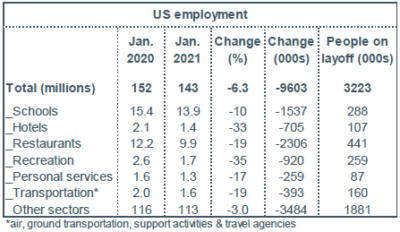 L’évolution future du chômage reflètera avant tout la normalisation des secteurs les plus perturbés au gré des avancées de la campagne vaccinale. Quelles projections d’emplois peut-on faire? En supposant que les écarts entre secteurs disparaitraient d’ici la fin 2021 et l’offre de travail reviendrait presque à la normale (réouverture des écoles, fin des aides exceptionnelles), cela impliquerait une hausse de l’emploi de 760K par mois en 2021. Le taux de chômage alternatif tomberait de 10% vers 5%. Dans les secteurs touchés, où la qualification est généralement faible, la part des employés que les employeurs sont prêts à reprendre sans délai (ces personnes sont classées comme étant on layoff) est plus faible que dans le reste de l’économie (tableau). Le rattrapage des créations d’emplois pourrait s’en trouver ralenti. Une hausse mensuelle de l’emploi de 500K par mois réduirait le taux de chômage alternatif à seulement 7%, soit le double du niveau pré-pandémie. Dans ces conditions, on comprend que la Fed ne montre guère d’inquiétude face au risque de surchauffe évoqué ici et là.