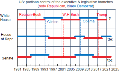 Les résultats, non-définitifs à ce jour, amènent à réduire les attentes en ce domaine. Si le Sénat reste sous contrôle républicain, comme il est très probable, tout ce qui ressemble de près ou de loin à une initiative démocrate un peu radicale sera combattu. Cela vaut pour les nominations aux postes-clé de l’administration, la politique fiscale, la réglementation, l’assurance-maladie, les enjeux environnementaux. Depuis l’élection de Bill Clinton en 1992, tous les nouveaux présidents avaient disposé, du moins en début de mandat, d’un Congrès uni (graphe). Ce ne sera sans doute pas le cas cette-fois-ci, ce qui ne peut que limiter la mise en oeuvre du programme économique de Joe Biden.