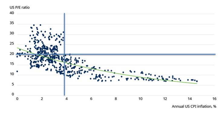 En théorie, les actions défensives permettent d’obtenir un rendement réel. Malheureusement, après 12 ans de bull market alimenté par la baisse continue des taux, les marchés boursiers se trouvent à des niveaux stratosphériques et se traitent à des multiples records. Or, le PE des actions tend à baisser en cas d’inflation. Comme on peut le voir sur le graphique ci-dessous, on n’a jamais vu des multiples supérieurs à 20 lorsque l’inflation dépasse 3.9%.