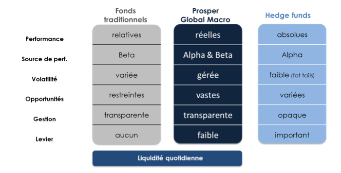 Prosper Global Macro combine les avantages d’un fonds d’allocation d’actifs traditionnel, en termes de régulation, de transparence et de liquidité, et ceux d’un hedge fund, en termes de flexibilité et de variété de sources de performance.