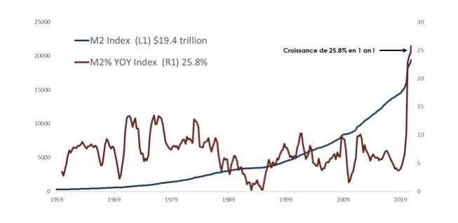 Comme on peut le voir sur le graphique ci-dessous, dans les années 70 et 80, lorsque l’on avait des taux d’inflation à deux chiffres aux Etats-Unis, la croissance moyenne de la masse monétaire (M2) était de 14% par an. Aujourd’hui, alimentée par les programmes massifs d’assouplissement monétaire, M2 a crû de +25.8% au cours des 12 derniers mois et on comprend donc l’inquiétude de certains observateurs!