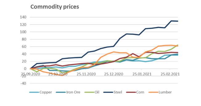 Pourtant, si l’on en juge par l’évolution des cours des matières premières, il faut avouer que les investisseurs ont tout de même de quoi s’inquiéter. Ainsi, le prix du baril de brut a doublé depuis mai 2020 et l’indice RICI des produits agricoles a grimpé de +30% en l’espace d’un an. Et ce ne sont pas des cas isolés, comme le montre le graphique ci-dessous.