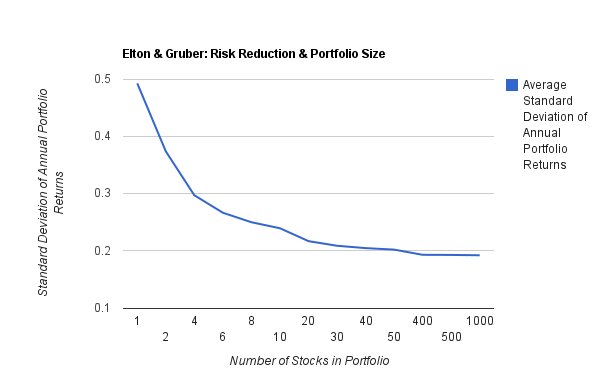 Dans le livre d’Elton et Gruber intitulé «Théorie Moderne du portefeuille et Analyse des investissements», les auteurs ont conclu que le risque moyen (tel que mesuré par l’écart-type) d’un portefeuille composé d’un seul titre était de 49,2% et que l’augmentation du nombre de titres jusqu’à 1 000 peut réduire cet écart-type à une limite basse incompressible de 19,2%. Ils ont également montré qu’un portefeuille constitué de 20 titres voyait déjà son risque réduit à environ 20%.